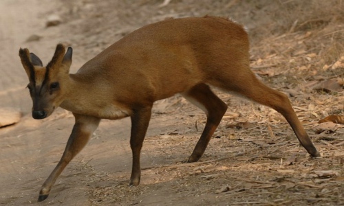 鉴别特征:貌似小麂而体大,属中型麂类。体重20-33kg,体长1000-1200mm,肩高500-600mm。头较大、耳宽长。雌雄额腺粗长。雄性具鹿类之冠的二叉骨质角,角柄和尖端显著内后弯的角主枝均长大,角表面具浅纵沟,眉枝相对粗长;臀高肩低。四肢中长。头骨较大,吻颌狭长,颅全长200mm以上,颧宽大于90mm。鼻孔正常,鼻骨与前颌骨接触,前端内外几等长。毛色赤栗,显著与其它鹿类的有别。角柄前方被毛有一黑褐色纵行条纹。颏、喉灰白。颈下淡灰棕。腹、四肢近内侧及尾下纯白。尾背与体背色同。蹄口具白环。左右蹄印紧靠且较大(长40mm左右,宽约25mm),蹄印大于小麂蹄印。粪粒形似中大花生米,呈散粒堆放于树脚,行进线或藤灌下空地。